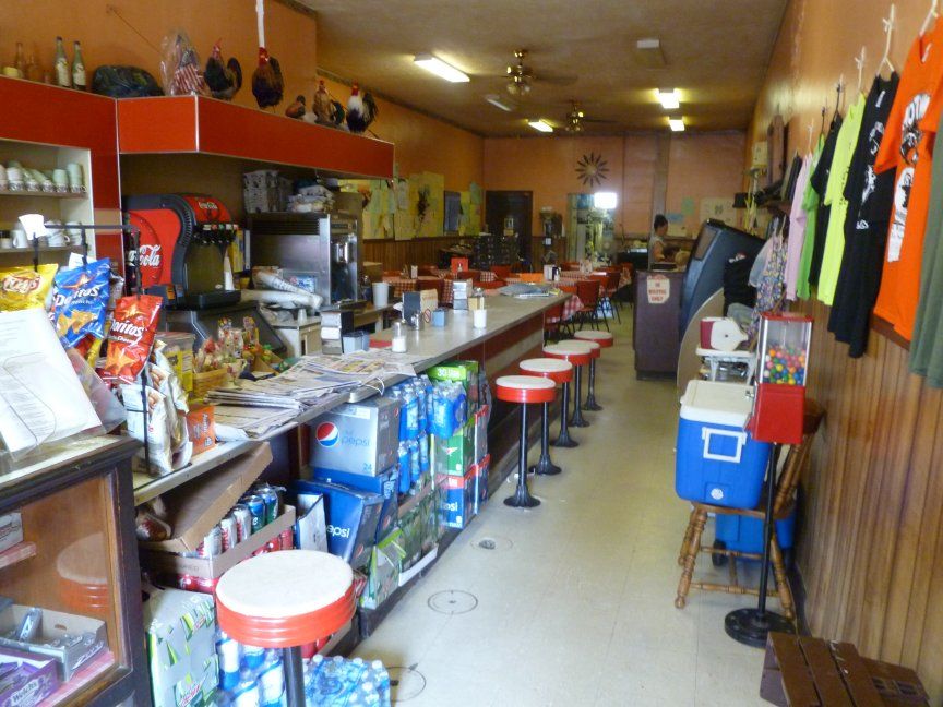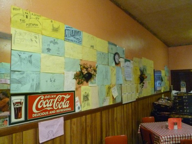 The walls of Harris' are covered in the Mothman artwork of child patrons, drawn on the backs of their placemats in crayon.