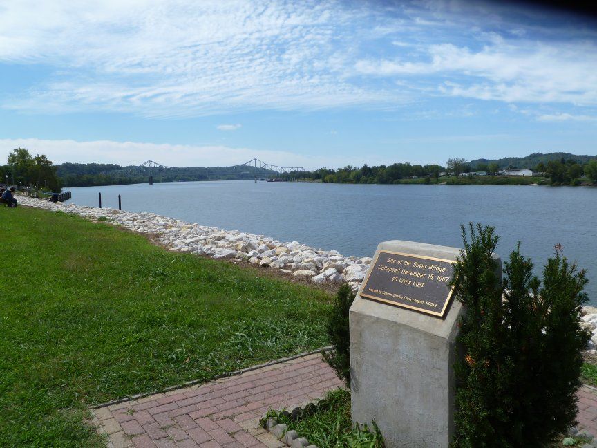 The Silver Bridge memorial, West Virginia side. The replacement Silver Memorial Bridge is seen in the background.